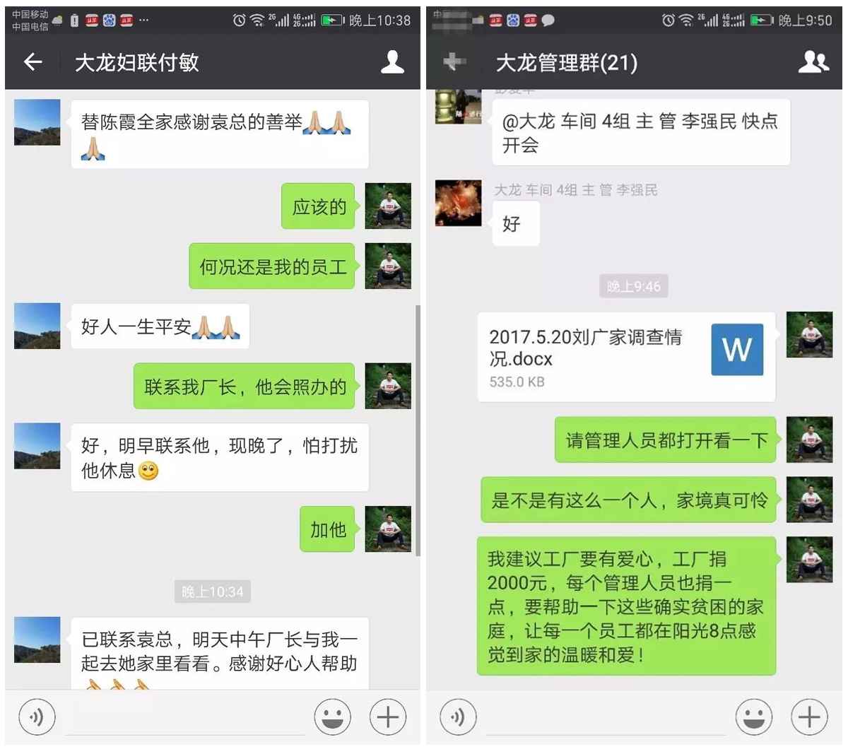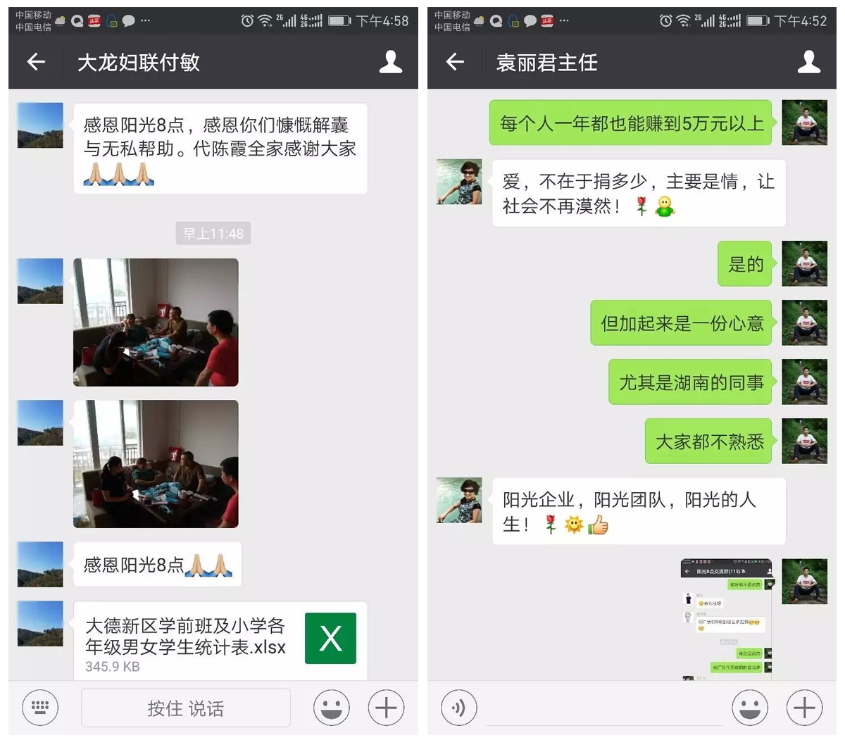 當天晚上,在貴州省陽光箱包的袁廠長走訪完陳霞的家庭并表明情況后,陽光箱包董事長袁仕偉立即決定,以陽光8點工廠名義向陳霞的家庭捐出2000塊,并號召貴州省、湖南省、廣州市的陽光8點員工行動起來,為自己公司的員工獻一份愛心。活動在群里一發起,很多陽光8點的員工紛紛響應號召。雖然那時已經很晚了,但許多員工依然很熱情地向發起人奉獻了自己的一份愛心,甚至還有一些做好事不留名的雷鋒同志。520這一天,陽光8點交流群的紅包只有一個人可以搶~因為這些紅包都是同事們對陳霞家庭的一份關愛。每一筆轉賬,每一個紅包,都承載著所有陽光8點員工的善良與愛意,這些愛匯聚在陽光8點,又傳達給需要幫助的同事。