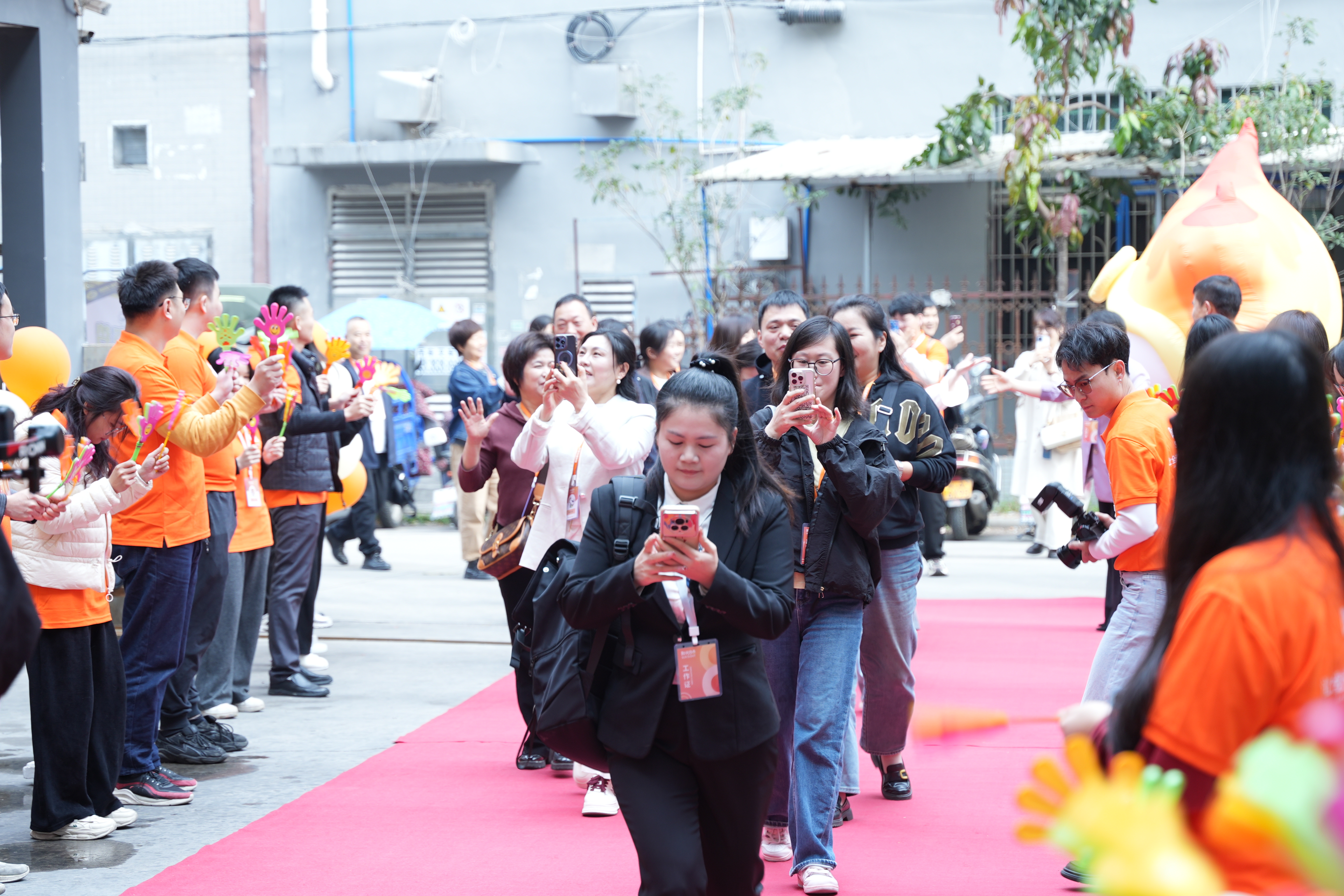 當(dāng)經(jīng)銷商們抵達(dá)大門的那一刻,陽(yáng)光箱包集團(tuán)的熱情便撲面而來(lái)。公司大門前,身著橙色 T 恤的同事們整齊列隊(duì),臉上洋溢著真誠(chéng)的笑容,熱烈歡迎每一位遠(yuǎn)道而來(lái)的家人們。