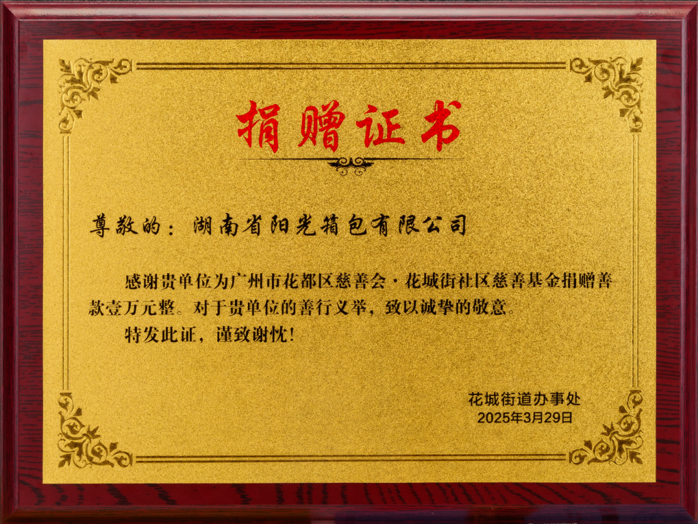 陽光箱包集團榮獲捐贈證書牌匾