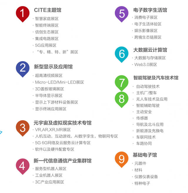 1號館-CITE展館:智能家電、音響、數字家庭、數碼產品、無人零售、智能硬件、智能家居、軟件與互聯網、云計算、大數據、軟件產品與信息服務;