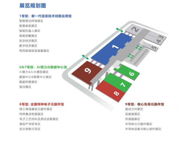 9號館:基礎電子館:電子元器件、儀器儀表及材料、電子生產制造設備、特種電子、IP及IC設計及解決方案展區