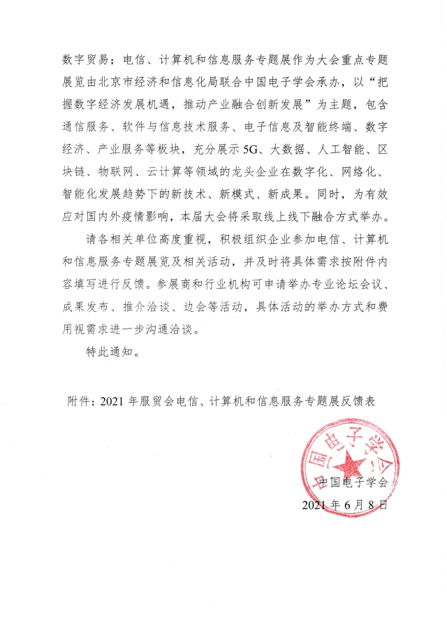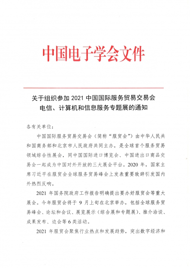 由中華人民共和國商務部和北京市人民政府共同主辦的中國國際服務貿易交易會將于2021年9月上旬在北京舉辦,大會同中國國際進口博覽會、中國進出口商品交易會一起成為中國對外開放的三大展會平臺,包括全球服務貿易峰會、論壇和會議、展覽展示、推介洽談、成果發布、邊會6類活動。電信、計算機和信息服務專題展作為大會重點專題展覽由北京市經濟和信息化局聯合中國電子學會承辦,現誠摯邀請貴單位幫忙組織及推薦重點行業企業,詳情請參見《關于組織參加2021中國國際服務貿易交易會電信、計算機和信息服務專題展的通知》及大會宣傳資料。