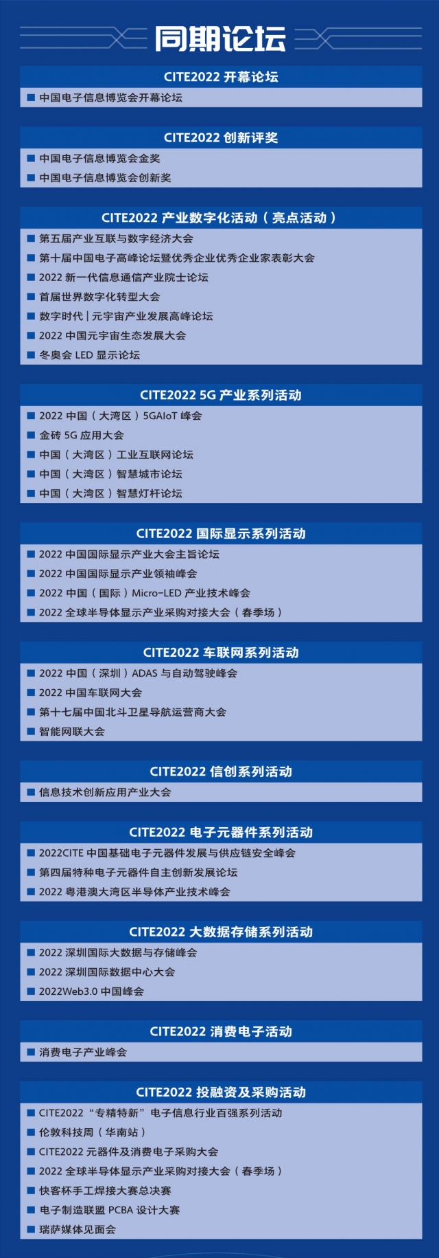 2022年4月9日-11日,第十屆中國電子信息博覽會在深圳會展中心舉辦,今年博覽會將吸引近2000家國內外展商、展出面積超10萬平米及12萬+專業觀眾到場參觀。本屆博覽會集中展示包括智慧家庭、智能終端、人工智能、AGV、智能制造、高端芯片、新型顯示、AR/VR、5G和物聯網等代表電子信息產業未來發展的核心內容。通過CITE主題館、新型顯示館、智能制造與AGV移動機器人館、機器人及智能系統館、智能家居及智能硬件館、汽車電子與智能駕駛、鋰電新能源館、電子元器件九個展館等25個專業展區,這除了是一場科技盛宴,也是一場行業思想盛宴,除了開幕式和五場高規格主論壇,大會還將圍繞產業數字化、5G+、高端顯示、信創、大數據存儲、車聯網、消費電子、電子元器件、投融資等熱門話題,推出40余場重磅論壇,助推中國電子信息產業的蓬勃發展,具體詳情如下: