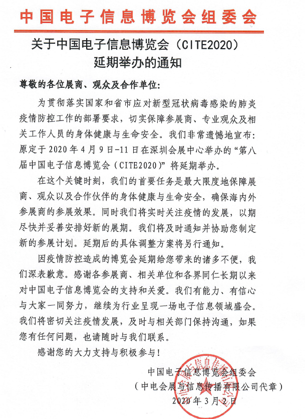 為貫徹落實國家和省市應對新型冠狀病毒感染的肺炎疫情防控工作的部署要求,切實保障參展商、專業觀眾及相關工作人員的身體健康與生命安全。我們非常遺憾地宣布:原定于2020年4月9日-11日在深圳會展中心舉辦的“第八屆中國電子信息博覽會(CITE2020)”“第95屆中國(深圳)電子展”將延期舉辦。具體開展時間根據疫情控制情況另行通知。