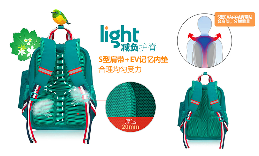 陽光8點書包采用S型減壓護脊肩帶,能均勻分散書包給肩部帶來的壓力,減輕背部負擔!全層添加20mm加厚透氣棉墊組合提供舒適的背負體驗,達到緩重減壓的效果!